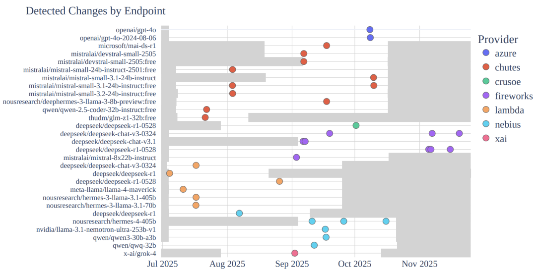 通过对189个API端点的长期监测,研究人员利用对数概率追踪这一灰盒手段,共捕捉到了37次显著的概率分布偏移。