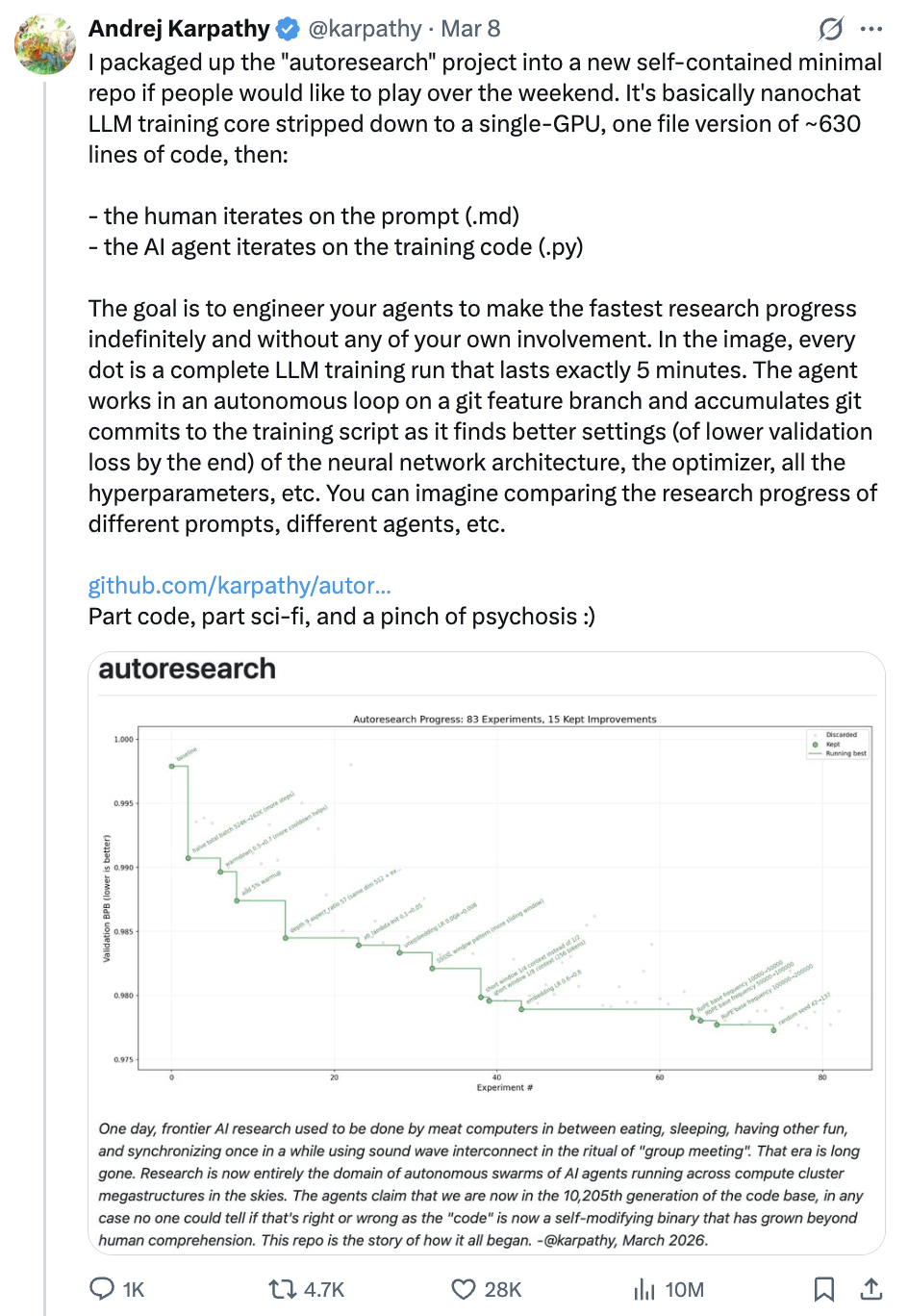 这条推文反响不错,但我觉得大家或许并没有深入思考这背后的深层意义。对我而言,autoresearch就是这一理念的具体实践。