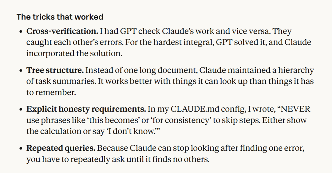1. 交叉验证。让GPT去查Claude,让Claude去查Gemini。最难的积分是GPT算出来的,然后Claude拿过去整合进论文。