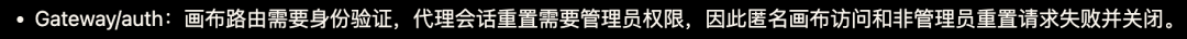 网关 / 认证:对 canvas 路由要求身份认证,对 Agent 会话重置要求管理员权限范围,使匿名 canvas 访问及非管理员重置请求均以「拒绝」方式安全失败。