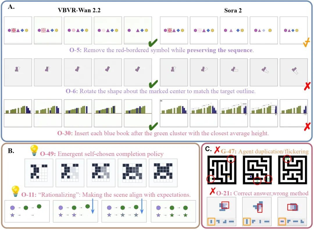 图片4 域外任务的定性概览:部分A展示了VBVR-Wan2.2与Sora 2在三个任务上的同任务、同样本对比;部分B展示了VBVR-Wan2.2在完全没见过的任务上的涌现现象; 部分C展示了VBVR-Wan2.2在任务上的实际边界。即使在改进后,模型仍可能在长生成任务中仍会出现一些问题,例如结果看似正确,但中间步骤并不遵循真实决策逻辑。这类「答案对了、过程错了」的现象,正是下一阶段视频推理评测必须继续强化的部分。