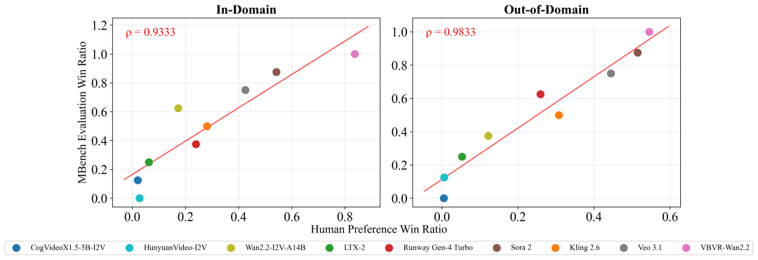 图片3 人类偏好对齐分析:VBVR-Bench 自动胜率与人工偏好胜率呈高度相关。