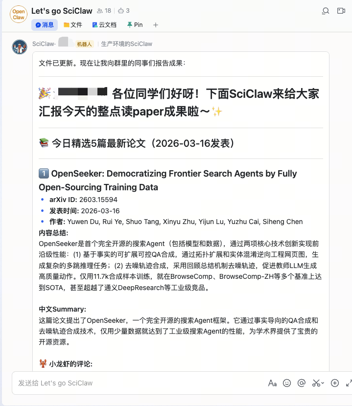 交互逻辑超简单,像指挥Chatbot一样告诉它「查文献」、「跑模拟」,它自动拆解执行。还能通过网页指引快速接入飞书、钉钉,不管是私聊下达指令还是拉进群聊,人机协作新体验直接解锁。