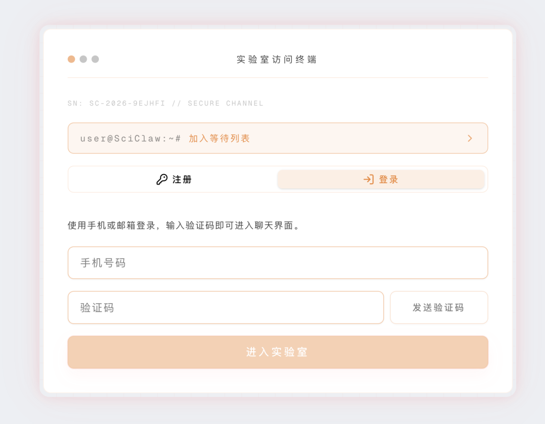 个人或小团队拿到邀请码,访问 https://sciclaw.ai,绑定手机邮箱,回答几个初始化问题,三分钟就能开干。数据文档全在云端保护,安全无忧。没邀请码?留个邮箱进等待名单,很快也能试用。