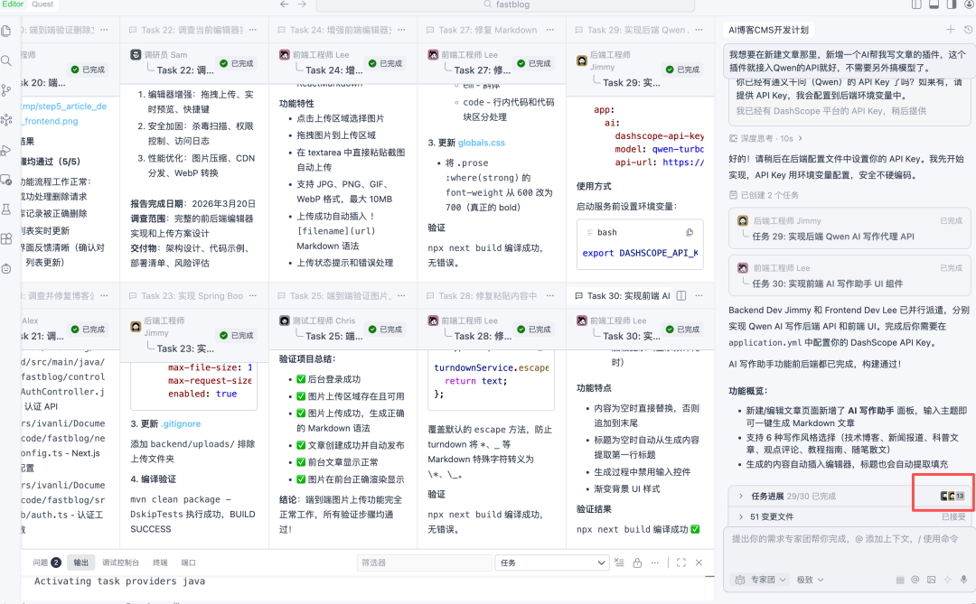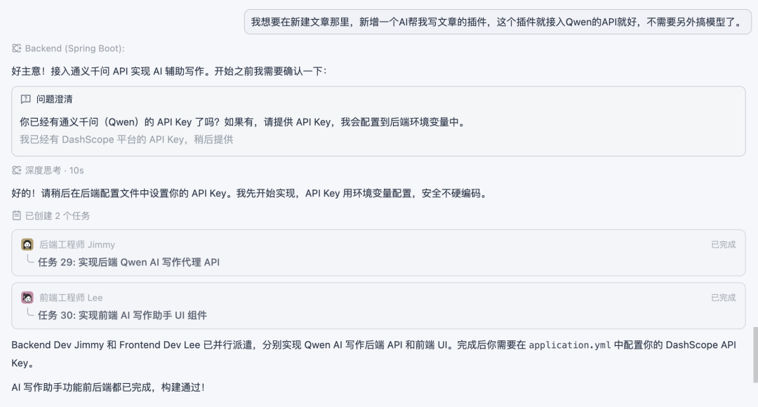 它帮我自动解析需求,分配任务,调配前端、后端、测试、运维等不同职责的“工程师”,驱动多个智能体同时推进任务,直接让我躺着当了回CTO。