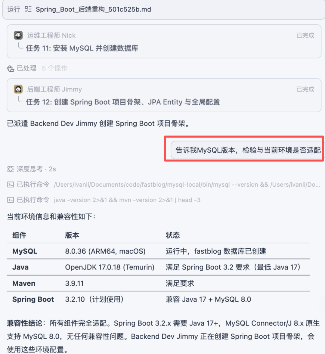 本地装好MySQL后,我担心不同组件之间会有版本冲突,所以我在此时介入提出了内心的疑问,系统给出了让人放心的回答。这也是Qoder专家团模式的特点,开发者可以随时介入流程,提出问题或者改变需求。