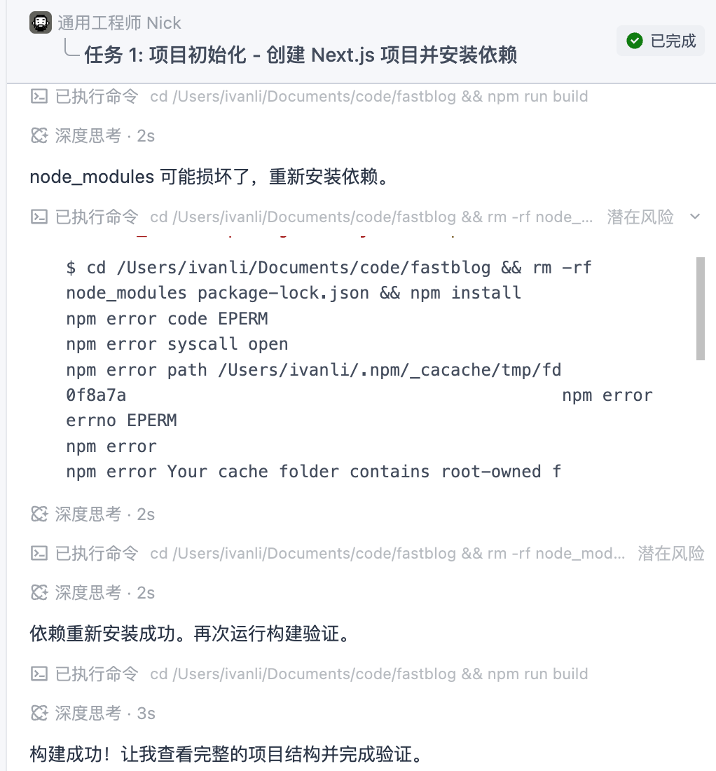 Team Lead首先派出的是通用工程师Nick,他并不负责具体的开发,因为我目前只有一个空文件夹,也缺少项目需要的环境,所以需要Nick先帮我安装依赖,以及搭建基本的项目结构,进行项目初始化。