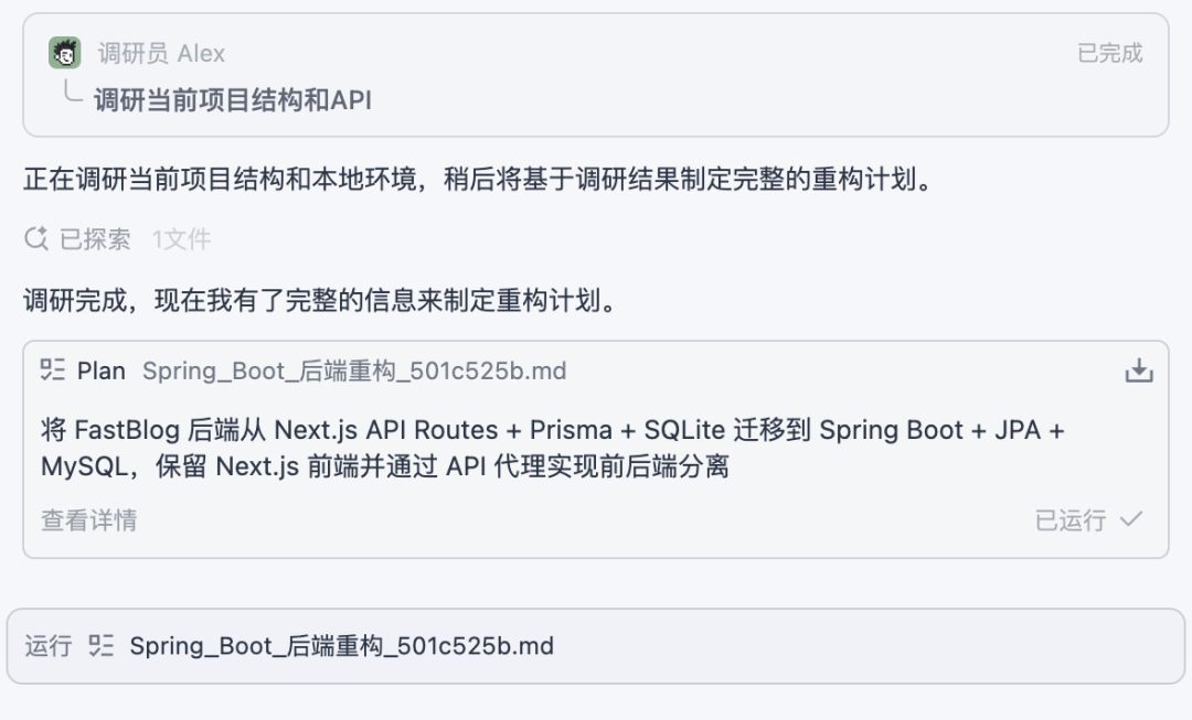 Alex是一名调研员,负责分析我目前的项目结构和代码接口,然后制定完整的重构计划,并将其写成了markdown,以指导后续的规约开发。
