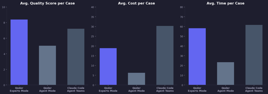 总的来看,「专家团模式」加快了开发效率,提高了代码质量。Qoder采用内部复杂任务基准对「专家团模式」进行了代码质量测试,结果显示专家团模式得分较自身智能体模式提升67%,领先Claude Code Agent Teams 16%。