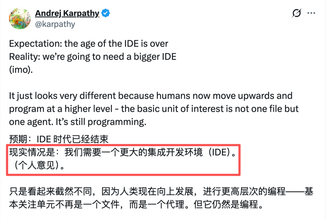 这一转变也要求AI IDE也从简单的编写代码和组织文件,转向组织智能体。这也符合卡帕西的预判,即AI Coding时代人们依然需要IDE,甚至需要一个更庞大的IDE,用它来管理智能体。这就是IDE未来的发展方向。