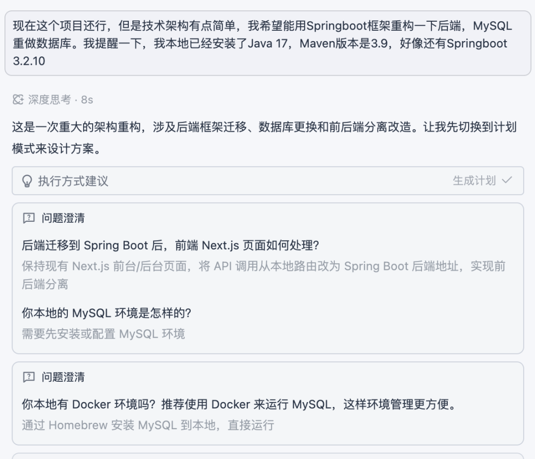 但目前技术架构还比较简陋,没有实现前后端分离,我决定上点难度,考验一下专家团的重构能力,让其用Spring Boot(Java开发框架)和MySQL(关系型数据库)重构一下后端。