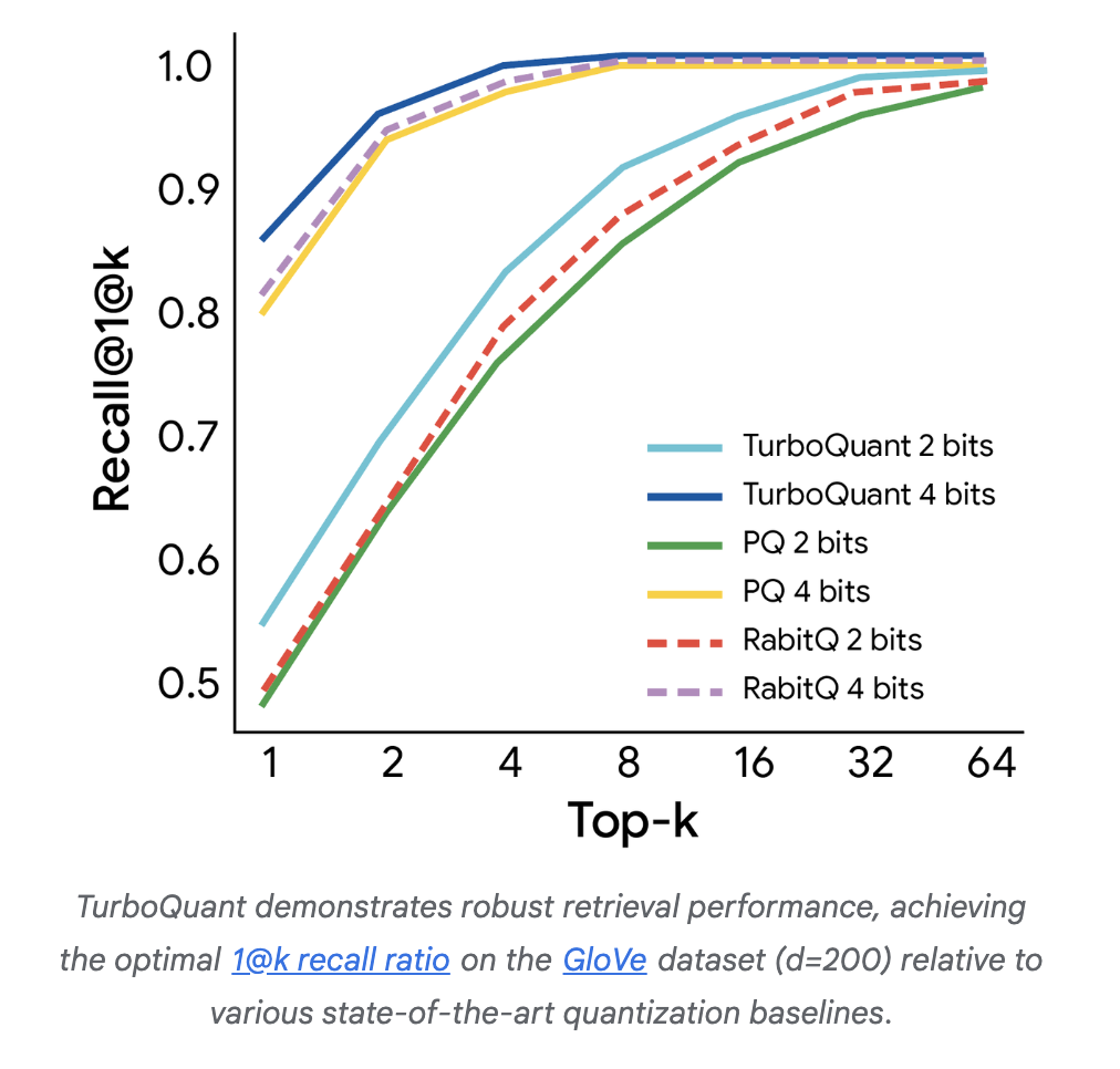 在向量搜索领域,TurboQuant同样超越了现有最优量化方法的召回率,而且不需要针对具体数据集做调优,也不依赖低效的大码本。