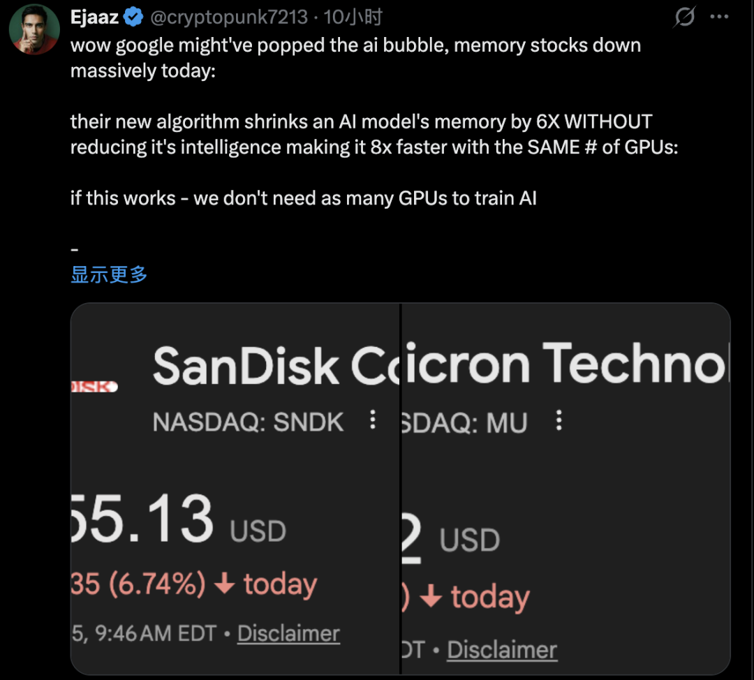 两家存储芯片巨头股价大跌,没有财报暴雷,没有供应链断裂,只是谷歌展示了一篇即将在ICLR 2026正式亮相的论文。