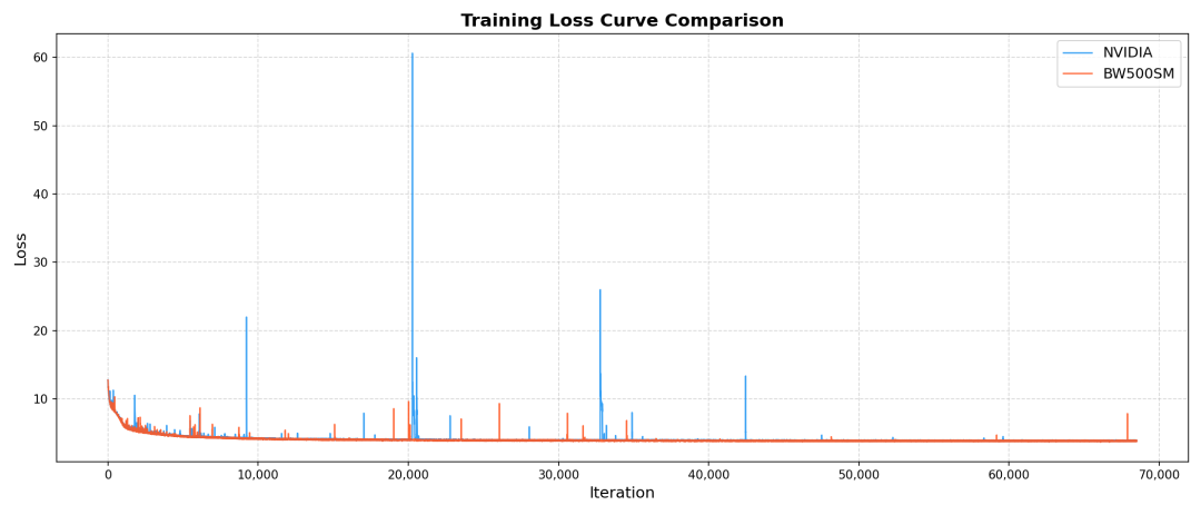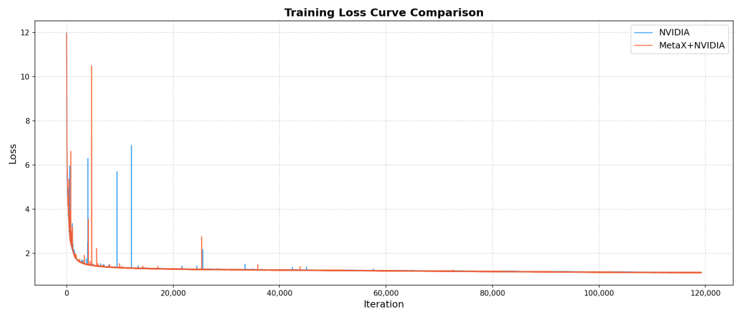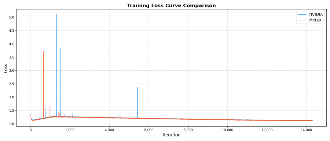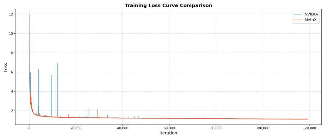 沐曦同构千卡的训练结果不仅在性能上达到了国际先进水平,更在精度上实现了与主流平台的高度一致,证明了FlagOS在调度、通信和计算优化方面的卓越能力。