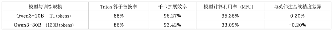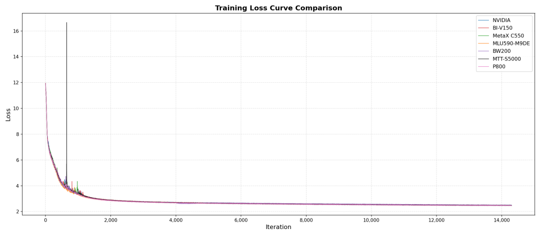 精度对齐:在Qwen3-0.6B语言模型上,各芯片的Triton算子替换率都超过80%,与英伟达基线训练的评测偏差均控制在2%以内,充分证明了训练效果的一致性。训练过程的Loss收敛曲线与英伟达平台高度一致,为后续的千卡规模训练奠定了坚实的性能基础。