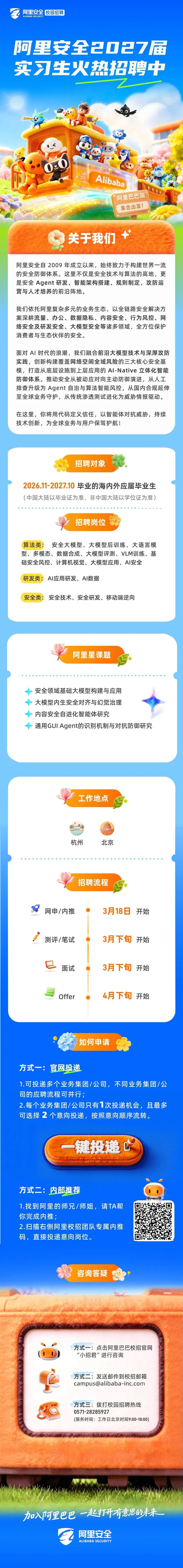 阿里安全2027届实习生招聘正式启动,本次校招新增七类AI岗位,AI相关岗位占比超八成,希望能为你提供更广阔的技术舞台。