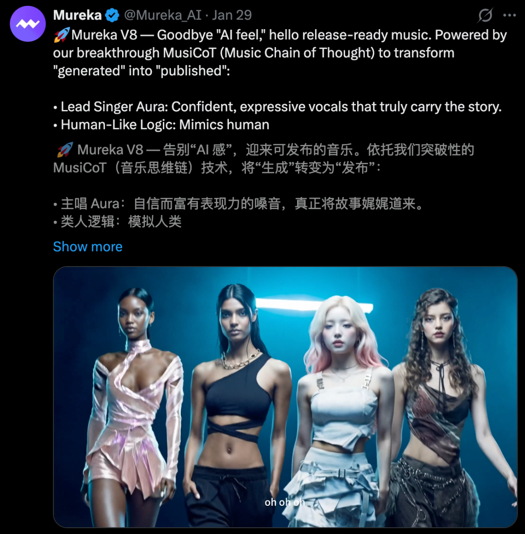 今年1月,Mureka V8正式面向全球首发。