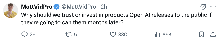 如果OpenAI推出的面向公众的产品,短短数月后就惨遭叫停,那我们凭什么要信任或投资这类产品?
