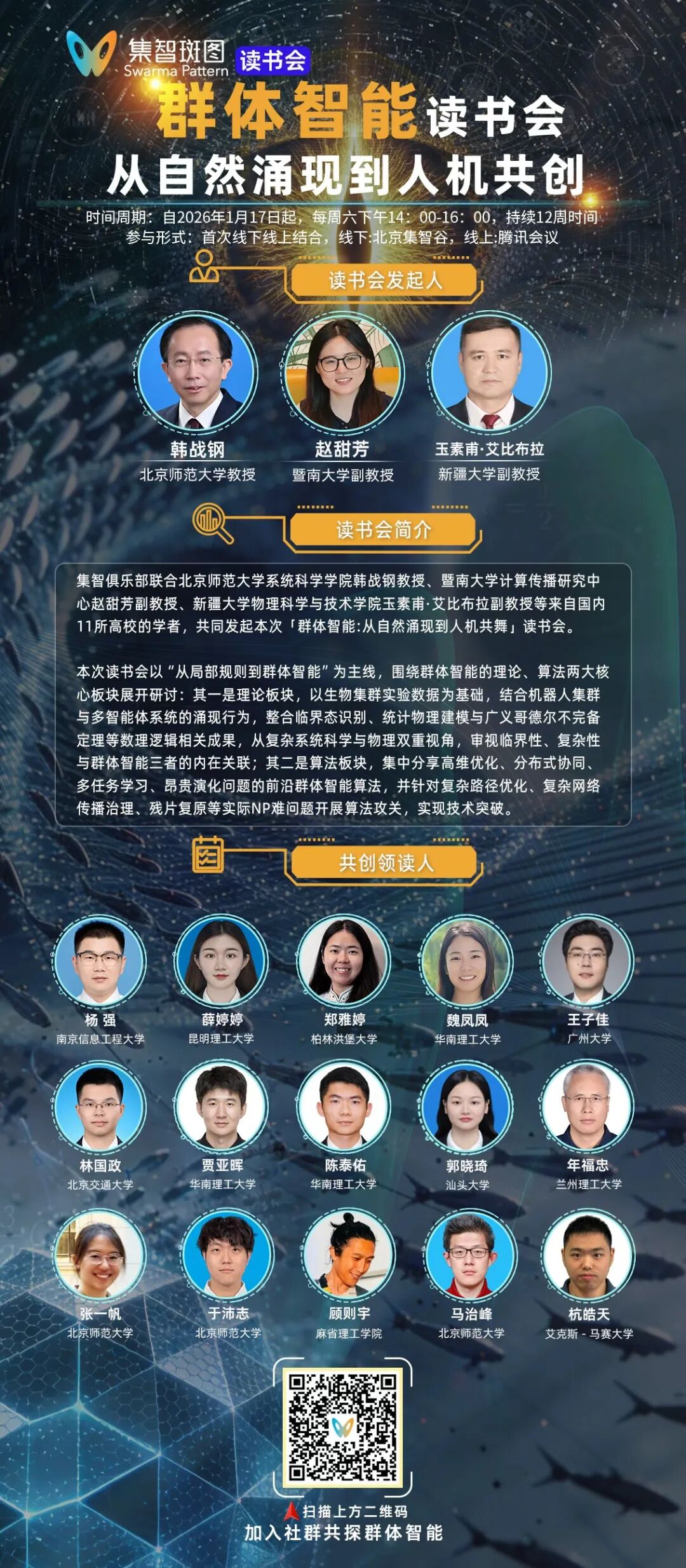 集智俱乐部联合北京师范大学系统科学学院韩战钢教授、暨南大学计算传播研究中心赵甜芳副教授、新疆大学物理科学与技术学院玉素甫·艾比布拉副教授等学者,共同发起本次「群体智能」读书会,尝试用一条普适的线索,把自然界的鸟群蚁群、人类社会的集群行为、以及人工智能时代的多智能体与群智优化,放在同一张地图上重新理解。读书会自2026年1月24日开始,安排在每周六下午 14:00–16:00,欢迎所有对群体智能如何涌现、如何被理解、以及如何被设计,感兴趣的朋友一起加入:带着问题来,带着更有趣的问题去。