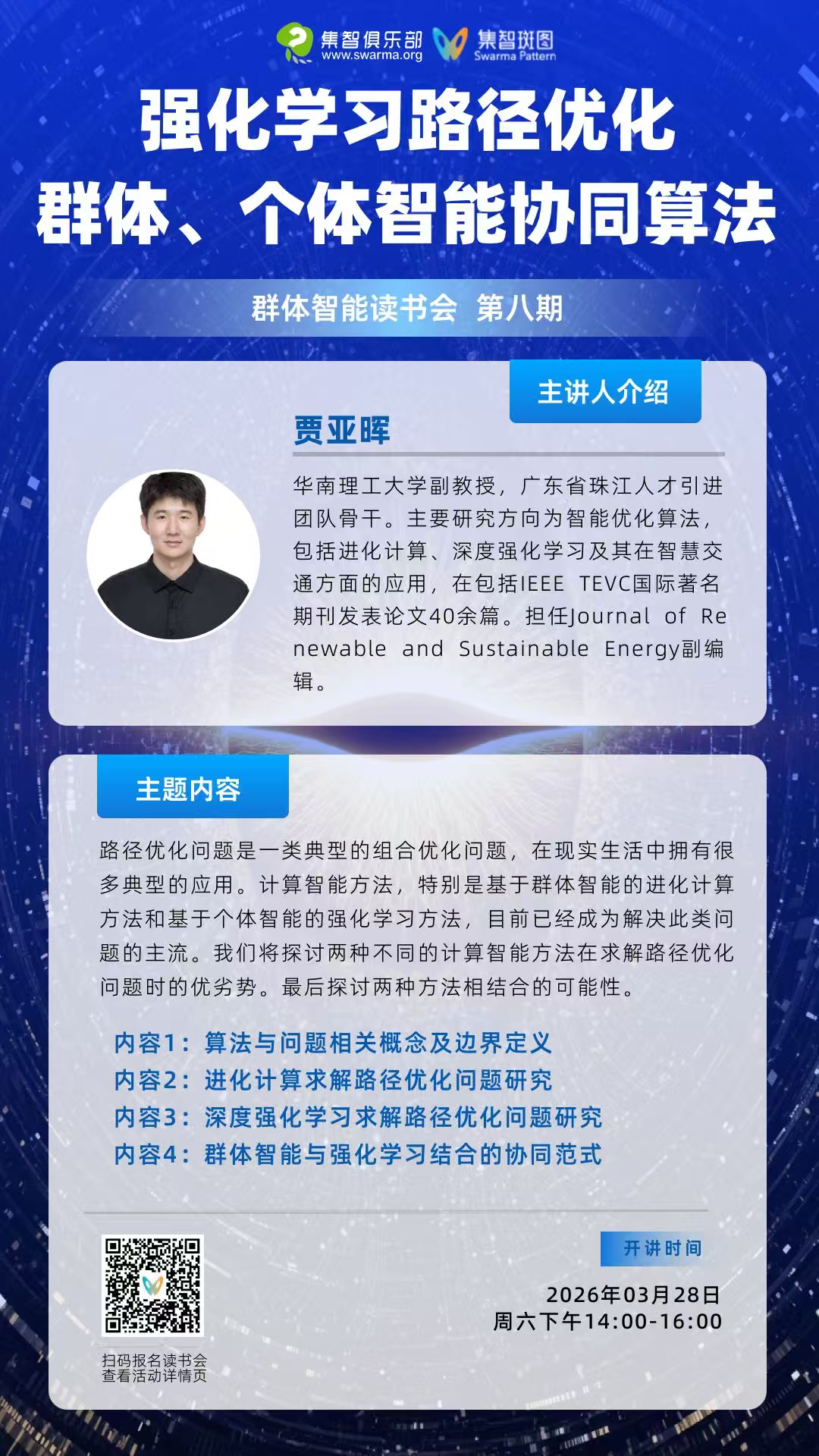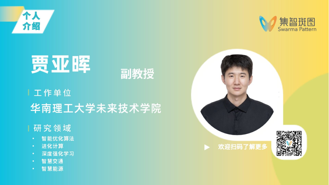主讲人:贾亚晖,华南理工大学未来技术学院副教授,博导,广东省珠江人才引进团队骨干,IEEE CIS Taskforce on Evolutionary Scheduling and Combinatorial Optimization组长,CCF协同计算专委会委员。曾担任新西兰惠灵顿维多利亚大学博士后研究员。主要研究方向为智能优化算法,包括进化计算、深度强化学习及其在智慧交通和智慧能源方面的应用,在包括IEEE TEVC, TCYB, TNNLS, WCCI等国际著名期刊和重要国际会议发表论文40余篇。担任Journal of Renewable and Sustainable Energy副编辑。