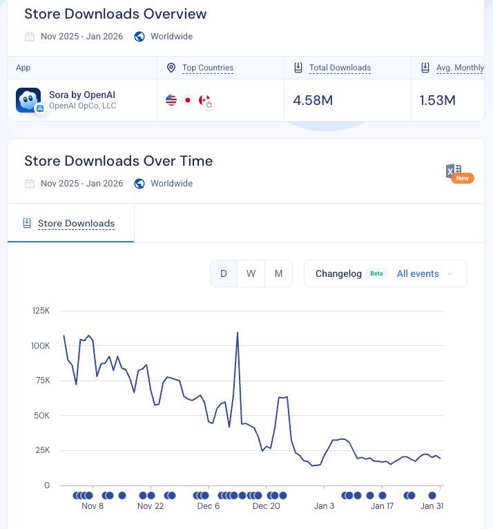 但到了今年1月,Sora单月下载量暴跌45%。这款APP整个生命周期,也就让用户掏了140万美元。