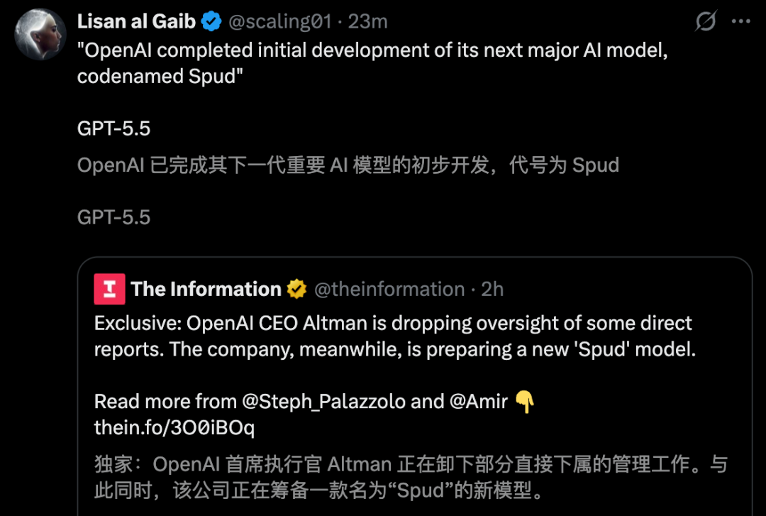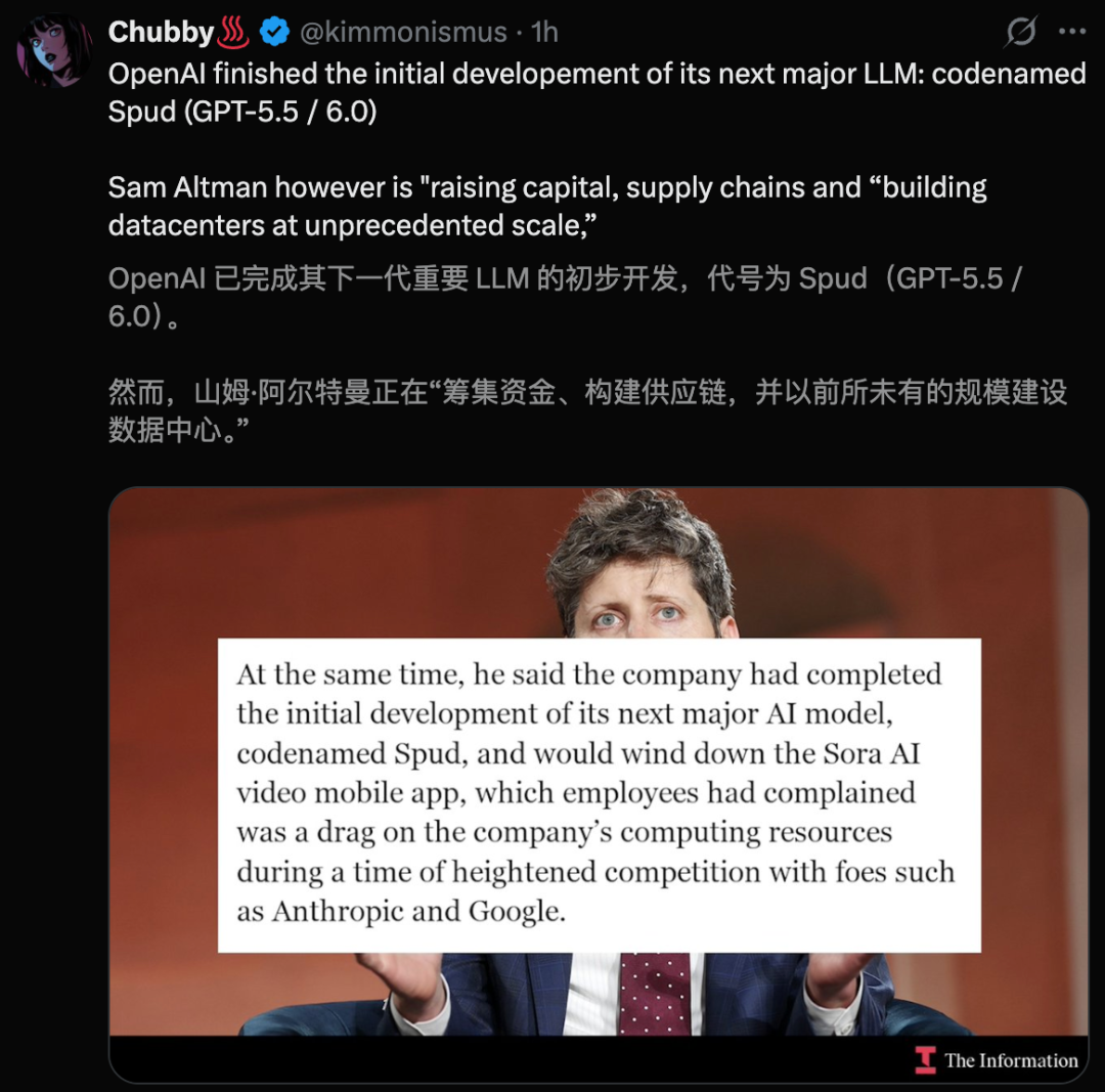 据称,OpenAI已完成下一代旗舰大模型Spud的预训练,预计在未来几周内上线。