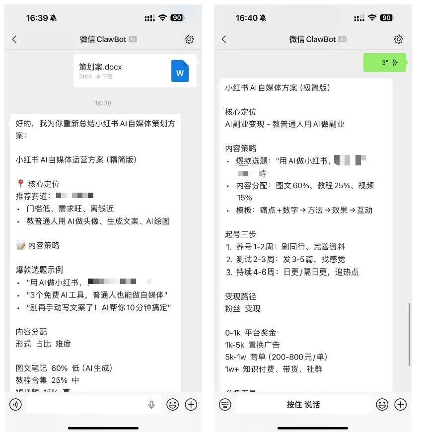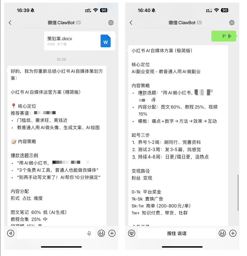 例如,我直接发个文件过去,顺脚捎带个语音,龙虾都能精准地识别文件和语音中的内容,并给出相应的回复: