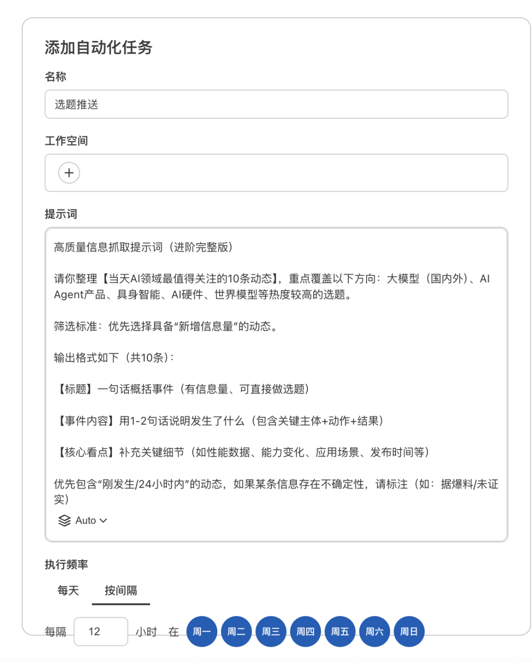 在指令里,我把标题形式、核心内容和关键看点都提前做了要求,并设定每12小时准时推送一次: