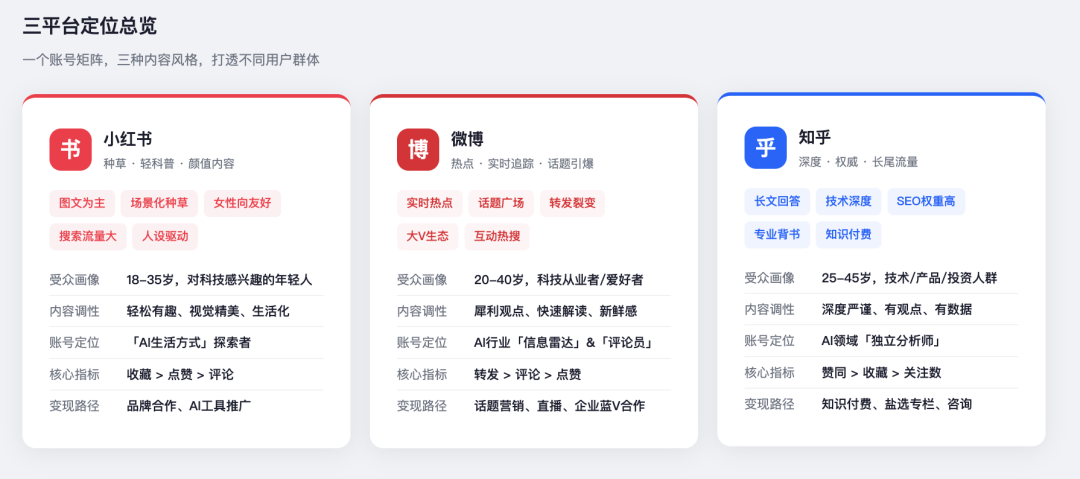 我想在小红书、微博、知乎上做AI自媒体账号,内容主要是围绕AI Agent、具身智能、AI硬件、硅谷公司等选题去做,分别针对三个平台的特征帮我定制一份内容创作策略指南。