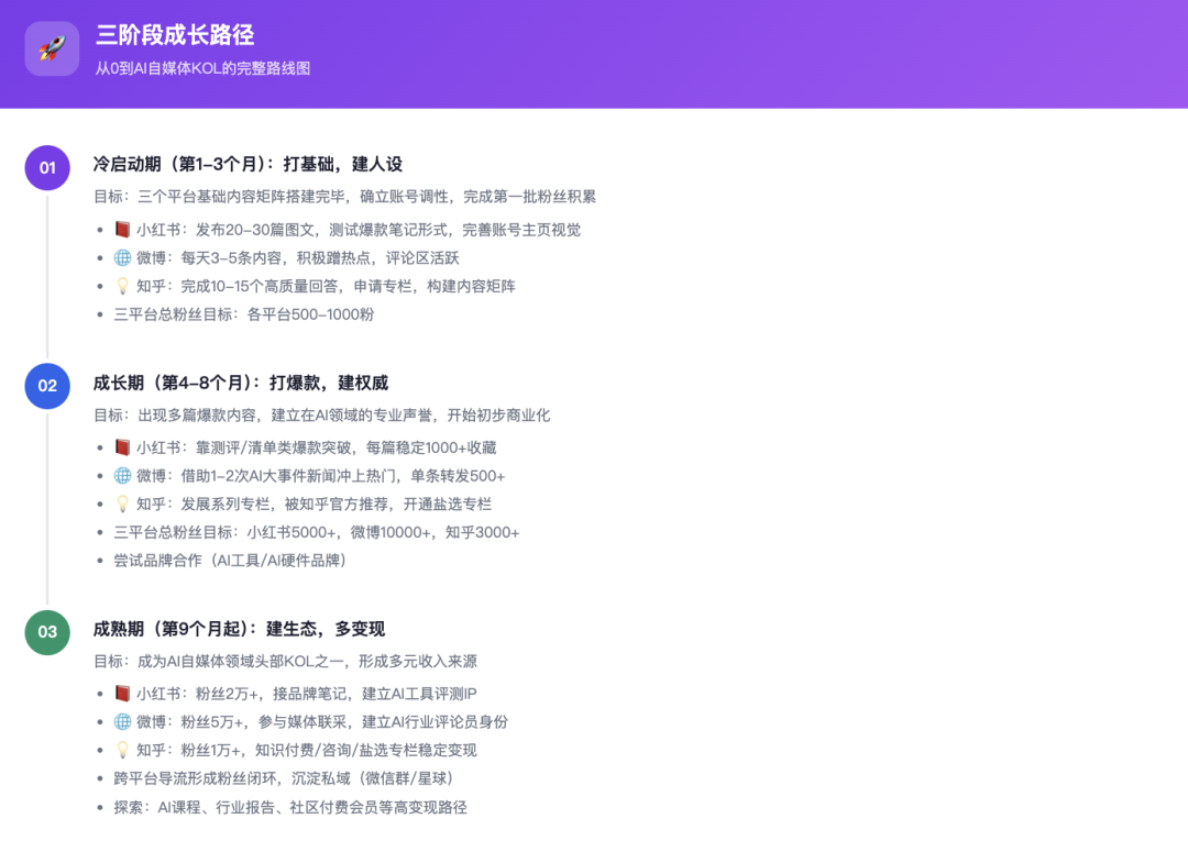 比如人家一上来就点明,前三个月是打基础、立人设的关键期,重点是把内容矩阵和账号定位先搭起来。