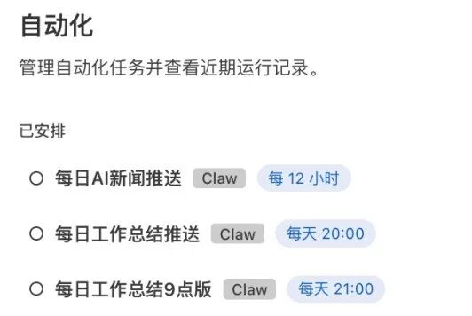 还支持自动化推送:一句话就能设置定时推送等自动化任务,坐等龙虾把信息送到眼前,省心啊省心。