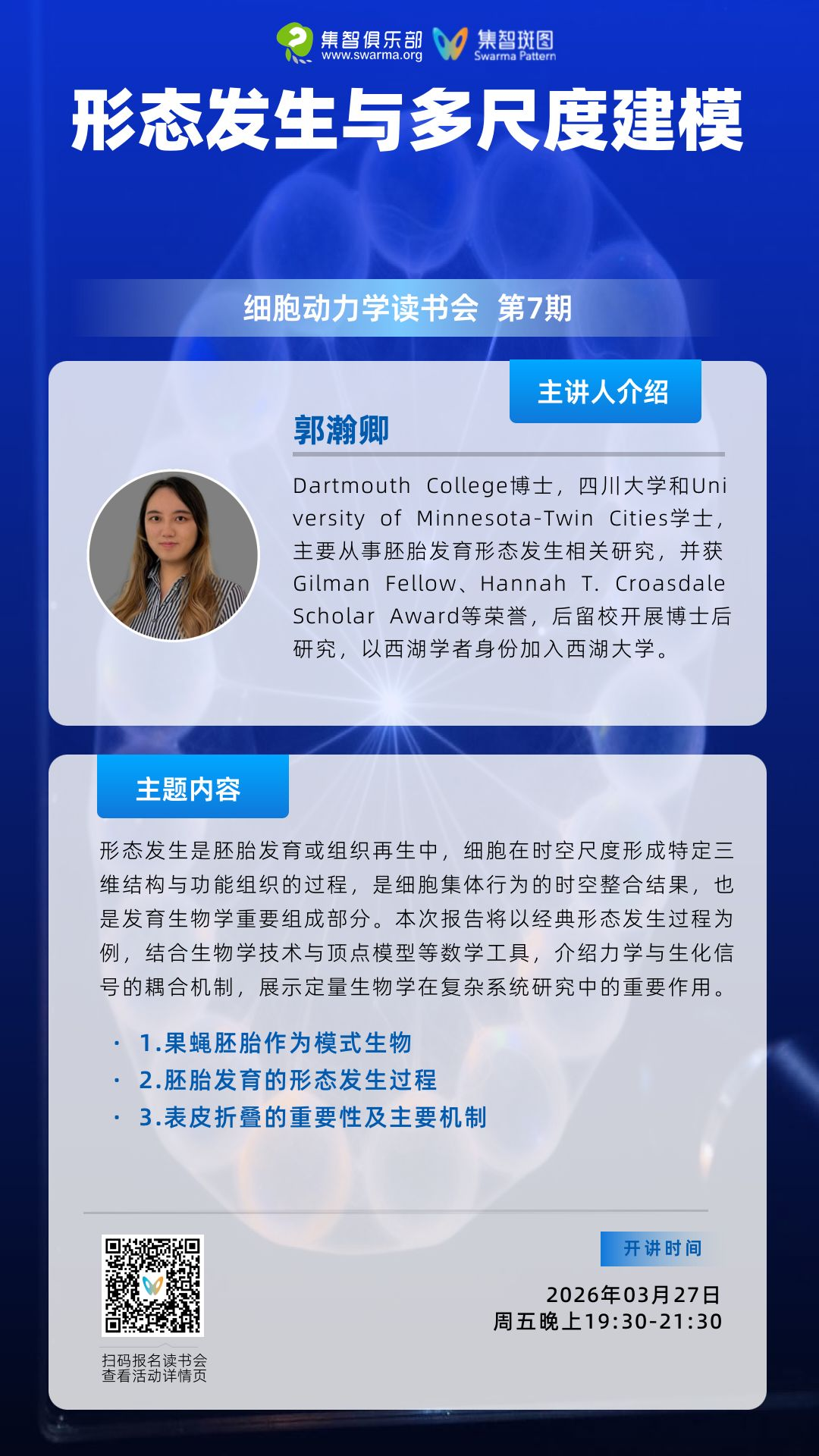 2026年3月27日(周五)晚19:30-21:30,腾讯会议线上进行,微信视频号+集智俱乐部B站号同步直播,感兴趣的朋友扫码报名加入细胞动力学读书会后,可进入学员群进行交流。