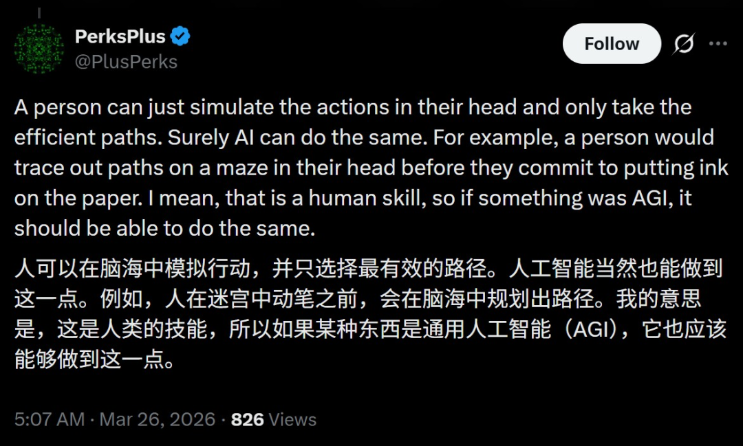 ARC团队在文档里写了一句话:「人类不会蛮力行事。他们会构建思维模型,检验想法,并迅速改进。」