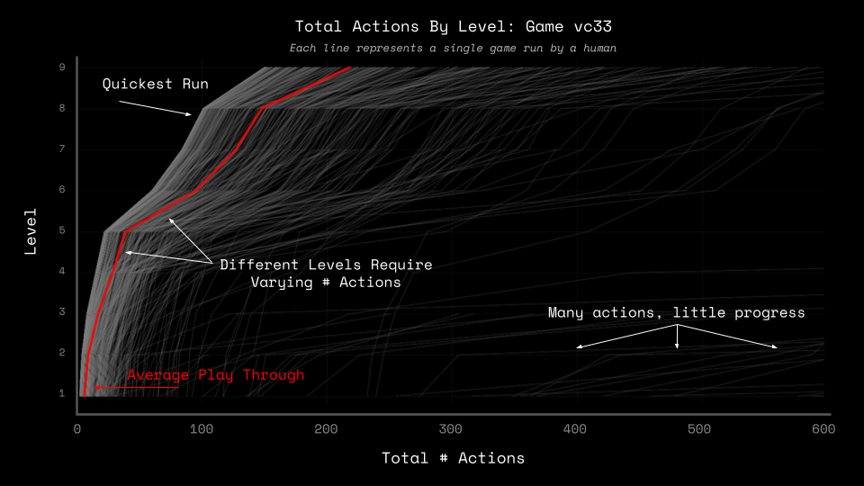 ARC-AGI-3的评分不看「有没有通关」,而是看「效率」,而且是和人类比效率。