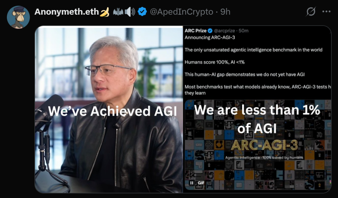 在最近的采访中,老黄认为我们已经实现了AGI。但是ARC-AGI-3显示,或许如今的AI连1%的AGI都没有实现。