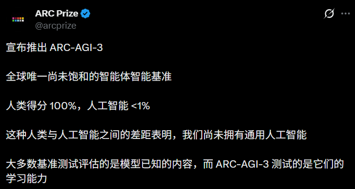 ARC-AGI-3没有任何「题海战术」可以覆盖,它考的是「怎么学习」。这恰恰是目前AI最弱的一环。