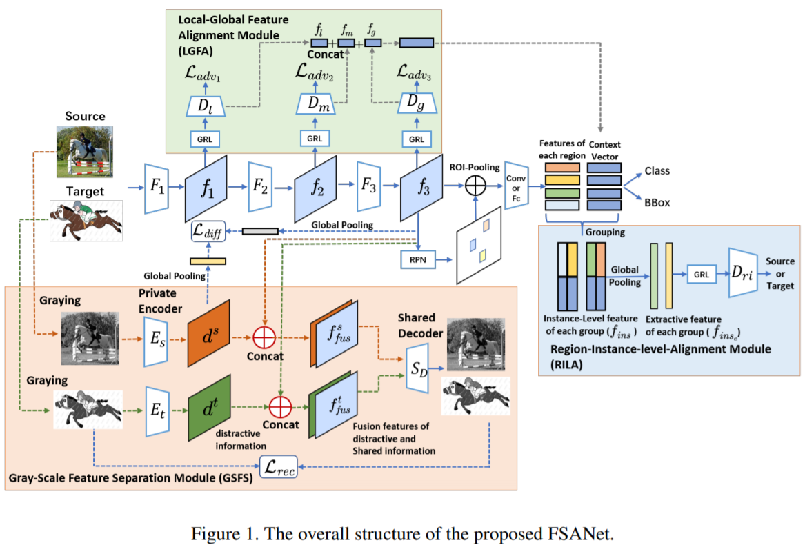 本文提出了一种新颖的用于领域自适应目标检测的特征分离和对齐网络(FSANet),该网络能有效分离干扰和冗余特征,使目标检测模型聚焦于对目标检测有用的特征。