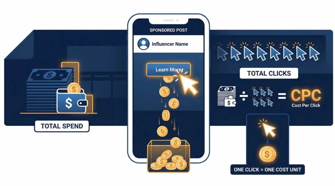 每一次用户点击链接花了多少钱。计算方式是总花费 ÷ 总点击数。SaaS 品类做达人营销,CPC 在 $2–$5 算健康区间;能做到 $2 以下是非常优秀的合作;超过 $8 就需要认真复盘了。