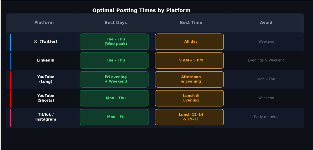 X(Twitter):周三通常是全周互动量的巅峰,周四开始下滑,周末流量明显偏低——大家都去过日子了。如果是配合产品发布造势,尽量安排在周二到周四。