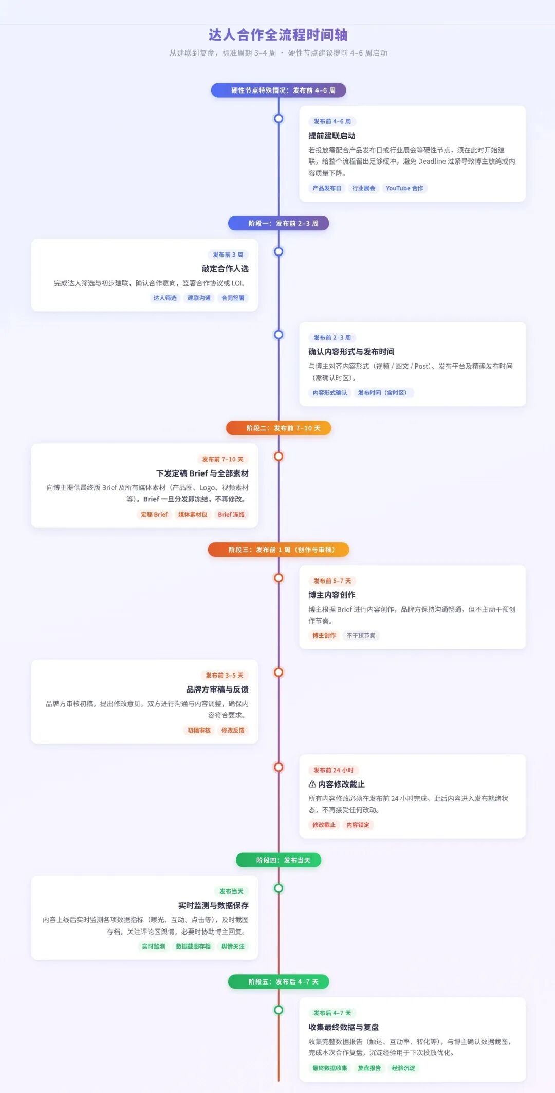 一次完整的达人合作从建联到复盘,通常需要至少 3-4 周的周期。