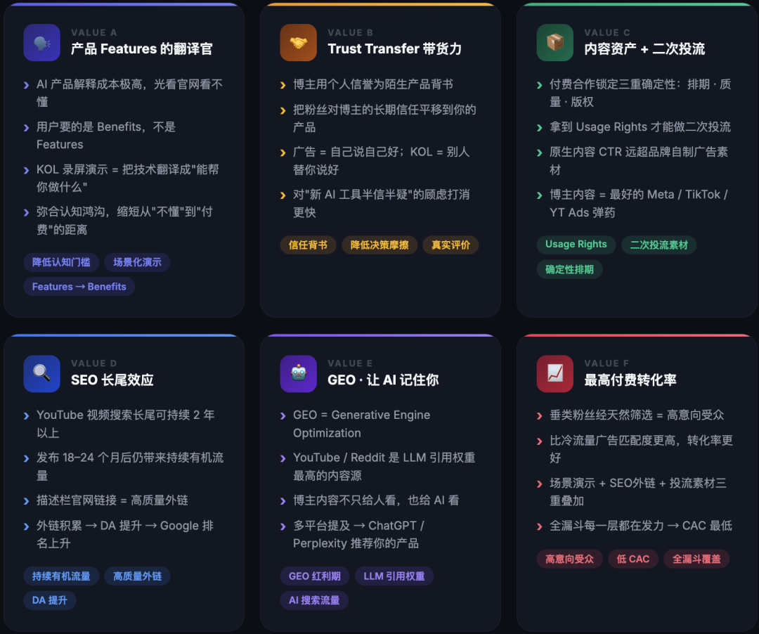 对 AI 产品来说这一点会更明显一些。大部分用户面对一个新的 AI 工具,多少会有点半信半疑:真有说的这么好用吗?这些疑虑单靠官网文案不太容易打消。但如果是一个他信任的博主亲自上手演示、给出真实评价,信任建立的速度会快很多。