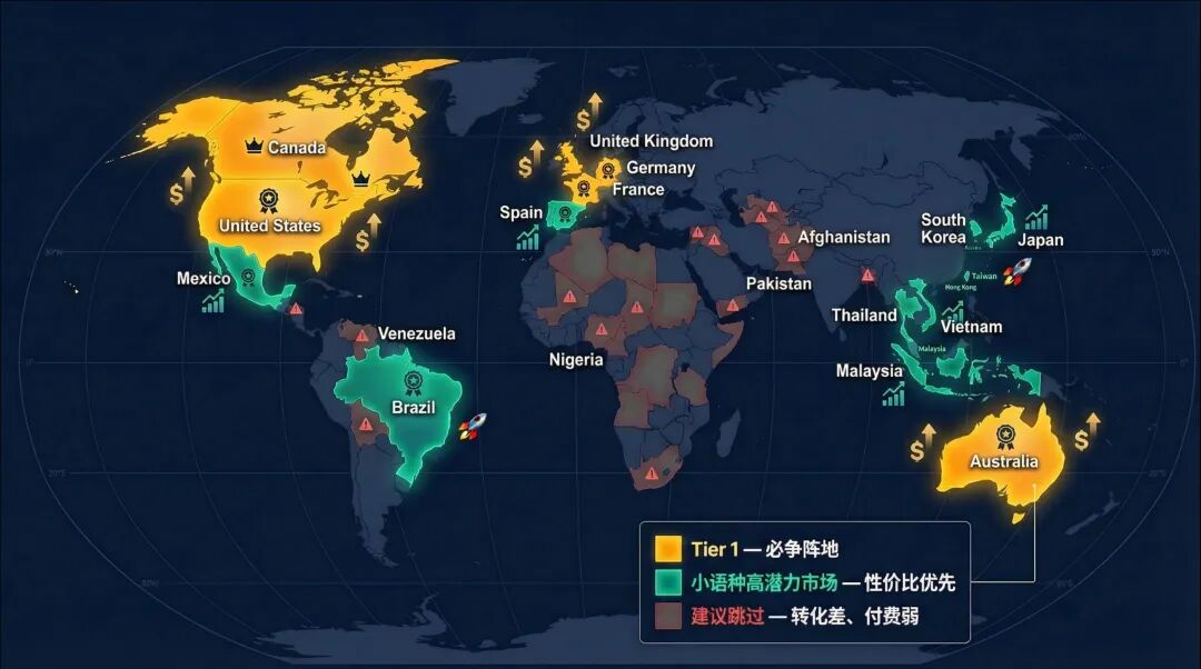 但 CPM 有个陷阱:不是越低越好。很多新手看到某次合作的 CPM 被拉到很低就觉得赚到了,仔细看后台,流量大量集中在非洲、印度。这些地区播放成本低,CPM 会被拉得很漂亮——但如果你的产品是 $20/月的订阅制、面向北美欧洲,这些曝光就是无效流量。数字好看,钱包没感觉。