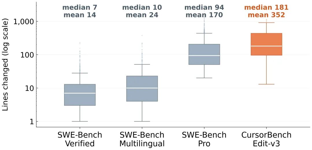 数据显示,CursorBench的代码修改量更大(中位数181行),而SWE-bench验证集和多语言版仅为7-10行;同时,CursorBench的指令提示更简洁,中位数仅390字符,远低于公开基准测试的1185-3055字符。