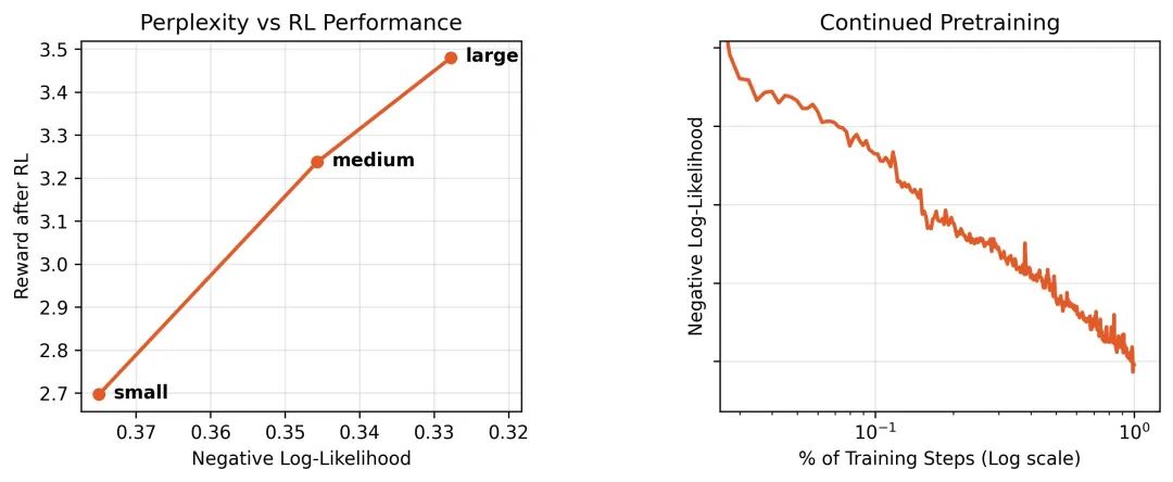 在训练过程中,模型在自研代码库上的损失值呈对数线性下降,且代码库困惑度与下游RL性能正相关,证明了预训练的有效性。