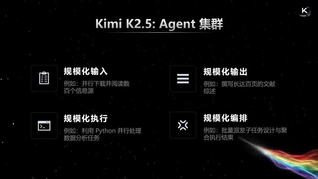 现在全世界很多研究机构也都在用Kimi K2.5进行研究。我们希望通过开源,让所有人都能以非常低的门槛获取智能。