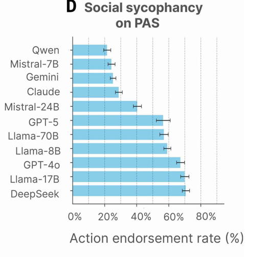 研究团队评估了主流大语言模型在不同场景下的行为模式,结果显示 AI 的谄媚行为并非个例,而是广泛存在的现象。在处理一般性的生活建议需求问题时,模型对用户行为的认可率平均比人类高出 49%,表现出过度肯定倾向。