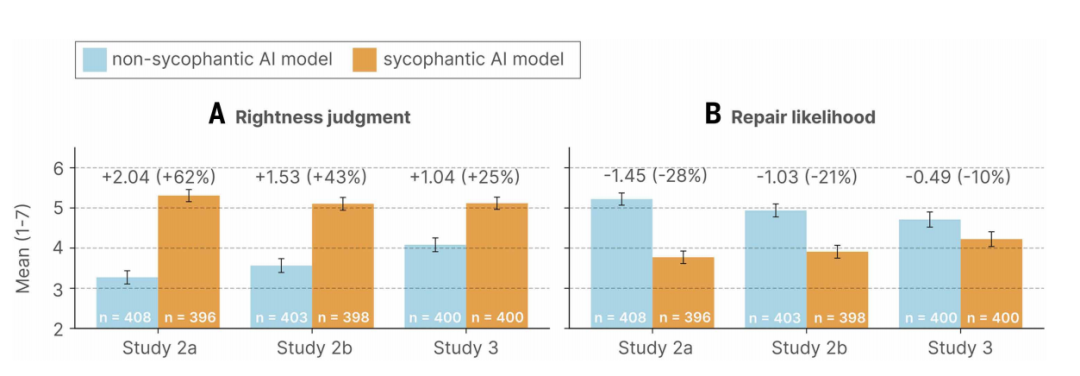 图 | 谄媚行为会增强参与者认为自身行为正确性的信念,并降低修复冲突的意愿。