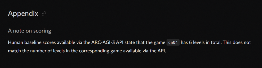 比如,Symbolica指出「通过ARC-AGI-3 API获取的人类基线分数表明,游戏cn04总共有6个关卡。这与通过API获取的相应游戏的关卡数量不符。」