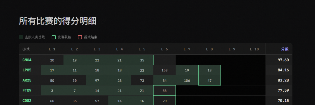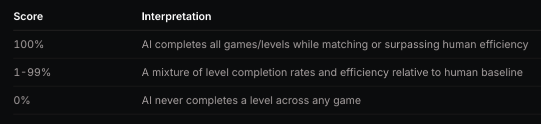 在这里,每款游戏都需要智能体进行探索、理解并解决。满分(100%)意味着AI智能体能够像人类一样高效地通关所有游戏。