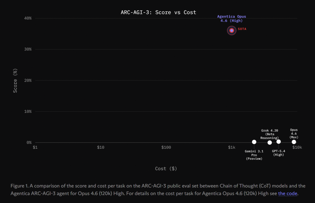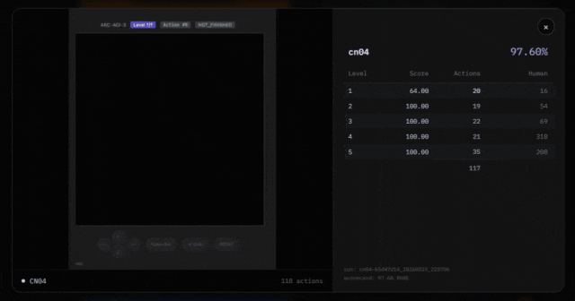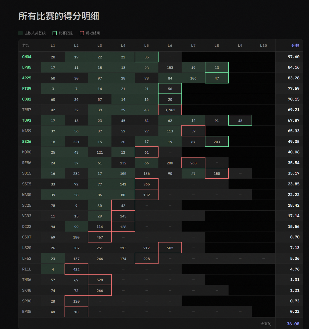 要知道,在ARC-AGI-3那个近乎变态的评分公式——(人类步数 / AI步数)^2——面前,大模型领头羊们还都在迷雾里原地打转呢。36.08%这个分数,简直是降维打击。
